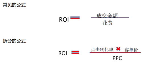 做到以上三點后,寶貝的ROI自然可以得到提高,而ROI越高,表明賬戶狀態越好,獲利越多。下面是ROI的兩個公式: