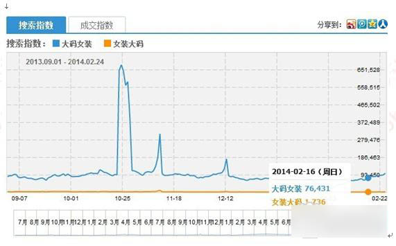 這個是用淘寶指數得出的結果,在搜“大碼 女裝”和“女裝 大碼”這兩個關鍵詞的時候,大家可看到,雖然關鍵詞的順序顛倒了,但是搜索量是一樣的。可是當搜索“大碼女裝”和“女裝大碼”的時候,搜索量卻足足相差了幾十多倍。