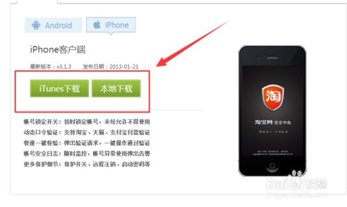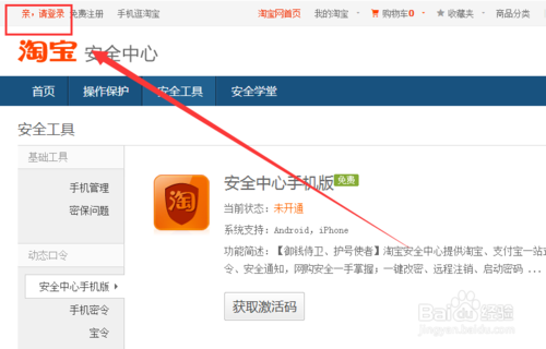 然后在打開的頁面,找到【安全中心手機版】的下載地址,再下載安裝到手機上。然后手機上打開【淘寶安全中心】,再登錄成功即可。