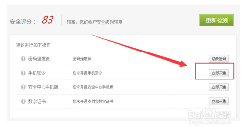 回到【淘寶安全中心】頁面,在頁面中找到【手機密令】這個選項,并單擊打開右側的【立即開通】按鈕,如下圖所示。