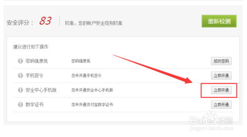 回到【淘寶安全中心】頁面,找到【安全中心手機版】,并單擊右側的【立即開通】。
