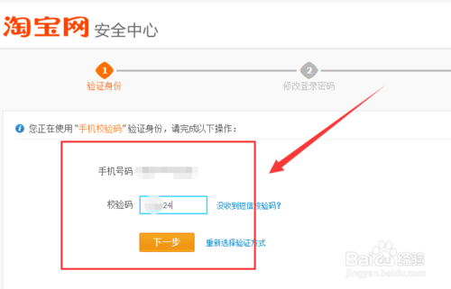 如果淘寶賬號綁定了手機號,這時需要輸入手機驗證碼,再單擊【下一步】,如下圖所示。
