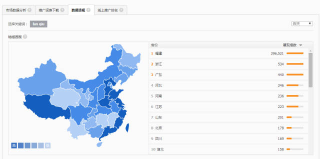 福建排第一,展現達到381904,山東排在第二,展現卻只有411。