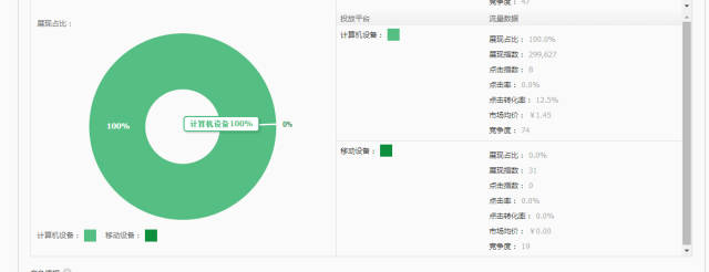 下面再來看看地域數據的透視圖,從中我們可以發現,展現基本上都是來自一個地方的,而且站內的展現占比和計算機展現的占比都是100%,雖然不能百分之百確定這個詞是刷出來的,但是我們基本上可以認定,這樣的詞對于我們來說是沒有任何意義的。