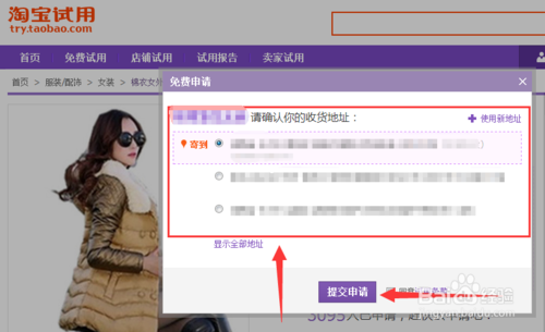 然后在彈出的窗口,選擇自己的收貨地址,再單擊【提交申請】按鈕即可。
