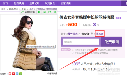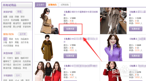 我們單擊進(jìn)入自己喜歡的類型,比如說女裝,然后在打開的頁面,尋找到我們喜歡的免費(fèi)試用商品,然后單擊【免費(fèi)申請】按鈕,如下圖所示。