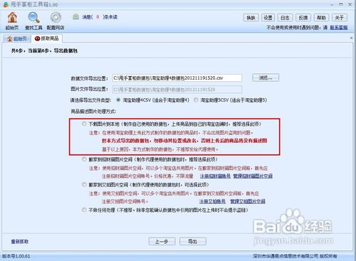 4、在這一步的時候選擇把圖片下載到本地或者選擇把圖片保存到第三方空間,這里推薦選擇把圖片下載到本地!然后到處數據包即可!然后再使用淘寶助理上傳就不會有“商品描述校驗失敗,您不能使用他人圖片空間中圖片”的問題啦!