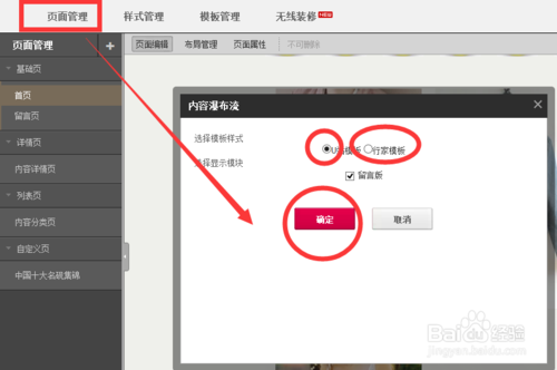 設置好背景之后,再回到頁面管理中,然后雙擊瀑布流頁面,彈出選擇窗口。在這里你可以選擇行家模板或者是u站模板,選擇好后,你可以通過右上角的預覽來了解你選擇模板的效果如何。如圖所示: