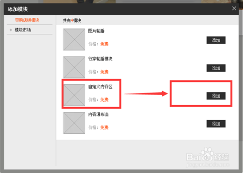 模板選定之后,仍舊在頁面管理窗口中,把鼠標移到瀑布流頁面的右下角,右下角就會出現增加模塊的字樣,點擊后彈出選擇窗口,你可以選擇“自定義內容區”模塊,記住你的權限只能選擇兩個這樣的模塊。如圖所示: