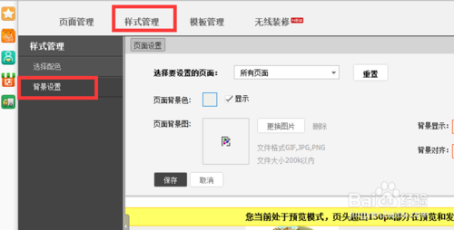 進入裝修界面,首先打開頂級菜單里的“樣式管理”。在這里你可以設置頁面背景色和上傳頁面背景圖片,這個按你的喜好來定奪。在這里的設置所見即為所得。如圖所示: