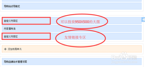 增加的兩個自定義模塊,一個用鼠標拖放到瀑布流頁面的上方,在這個自定義頁面里你可以放置一個950X500的大圖來增加網站的美觀性,而另一個自定義的模塊可以拖放到瀑布流頁面的下方,這個模塊你可以設置成為你網站的友情鏈接模板。