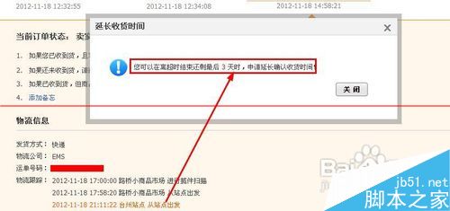 5、下一步在延長(zhǎng)收貨時(shí)間會(huì)出現(xiàn)一個(gè)對(duì)話框,提示“延遲收貨”的具體的時(shí)間,如圖所示;