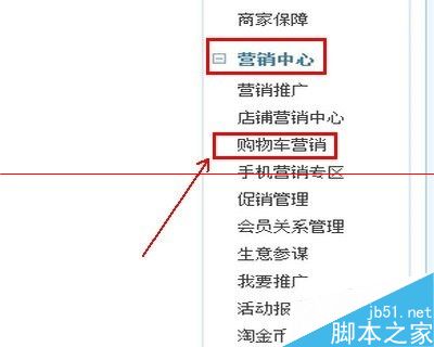 2、再用鼠標(biāo)拉動邊框,找到左邊中間部位的“營銷中心”---“購物車營銷”然后點擊。