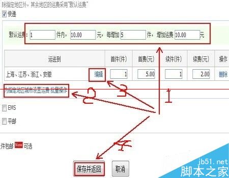 6、再根據(jù)指定城市設(shè)置快遞費(fèi),先點(diǎn)“為指定地區(qū)城市設(shè)置運(yùn)費(fèi)”然后點(diǎn)“編輯”根據(jù)快遞公司給你的不同城市的運(yùn)費(fèi)價(jià)格來設(shè)置運(yùn)費(fèi)模版,比方說上海、浙江、安徽、江蘇,首件快遞費(fèi)為5元,1公斤內(nèi),每加1公斤內(nèi),加1元,你可以如圖所示進(jìn)行設(shè)置。