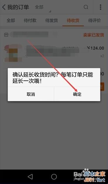 點擊延長收貨后,淘寶會彈出提示對話框,”確認延長收貨時間?每筆訂單只能延長一次哦!“我們點擊確定就可以了,如下圖所示。