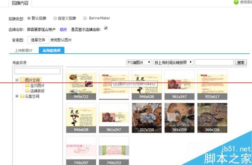 4、在背景圖片點擊“選擇文件”,可以在圖片空間選擇事先做好的店招圖片,也可以在“上傳新圖片”上傳店招,點擊保存