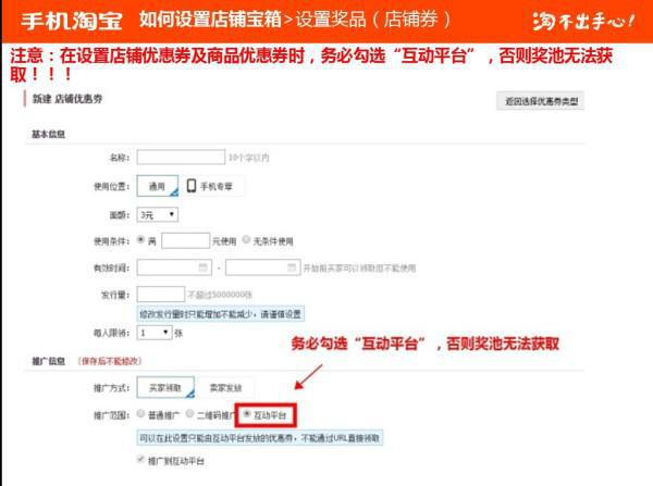 獎品如果是店鋪優惠券或者商品優惠券,都需要到營銷平臺設置新的券,且在設置券的時候,必須勾選“互動平臺”,否則獎池無法獲取;獎品如果是店鋪優惠券或者商品優惠券,都需要到營銷平臺設置新的券,且在設置券的時候,必須勾選“互動平臺”,否則獎池無法獲取。