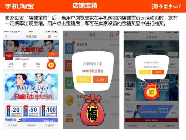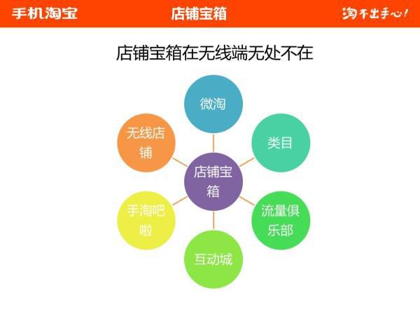 基于無線上的顯著變化,今年手機淘寶的搜索流量占比可能會逐漸下降,來自其它渠道的流量開始逐漸上升,也就是說,大量的流量會來自一些社區產品和個性化的產品。所以店鋪寶箱會跟無線端的各個頻道合作,出現在手機淘寶的各個角落,包括類目的頻道頁、活動頁、微淘、手淘社區吧啦、互動城、流量俱樂部、無線店鋪首頁等等,幫助大家吸引流量到店鋪。