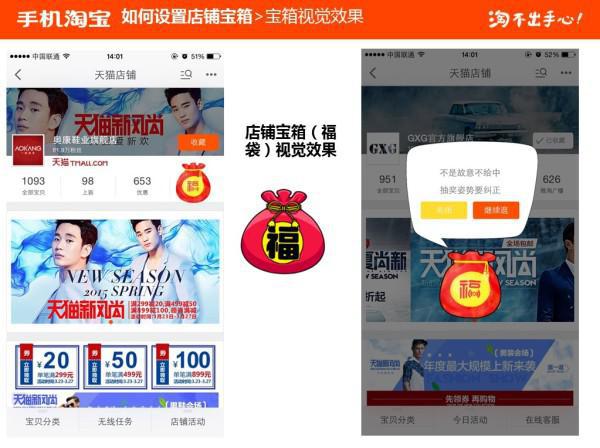 店鋪寶箱是今年淘寶無線端重點打造的互動工具,賣家設置“店鋪寶箱”后,當用戶瀏覽賣家的無線店鋪首頁or活動頁時,就有一定概率出現寶箱。用戶點擊寶箱后,即可在賣家設置的寶箱獎品中進行抽獎,獎品、中獎幾率、中獎次數等賣家都可以在后臺設置。
