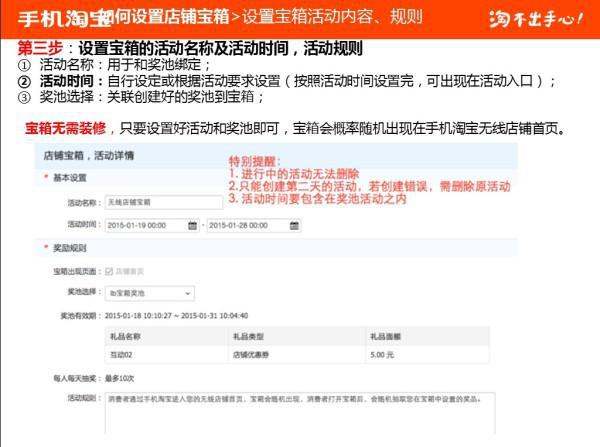 設置獎池步驟:先設置獎池名稱,獎池名稱主要是方便與寶箱活動綁定,獎池有效期(注意,獎池有效期應大于寶箱活動時間,否則設置不成功,且獎池與活動綁定后,時間不能修改)、單個買家的中獎頻率和次數,選擇獎品,獎池中的獎品可以選擇手機流量包(點擊查看介紹教程),店鋪優惠券,商品優惠券及實物贈品。