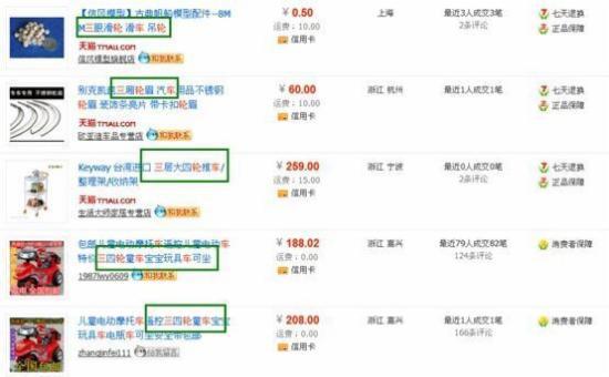 對于這種形式的關鍵詞,淘寶會認為他是一個詞,在展示搜索結果時,這個詞不管幾個字,必須完全連在一起并出現在標題中的寶貝才有被展示的機會。不連在一起的不能被提取出來,比如我們在淘寶的搜索框里面搜索“三輪車”這個關鍵詞: