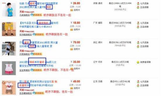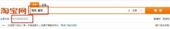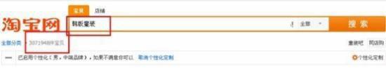 首先我們看到,這兩個關鍵詞的搜索結果,寶貝數是差不多的,搜“韓版童裝”是3071948件,搜“韓版 童裝”是3070858件。這說明,當淘寶認為以一個詞組的形式進行關鍵詞搜索時,單詞之間加或者不加空格的區別是很小的(包括寶貝的排序)。