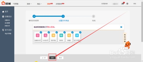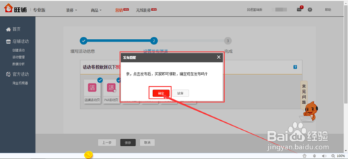 13、點擊“保存”以后會出現“發布提醒”,這里直接點擊“確定”,就可以發布紅包了,店鋪紅包完成。
