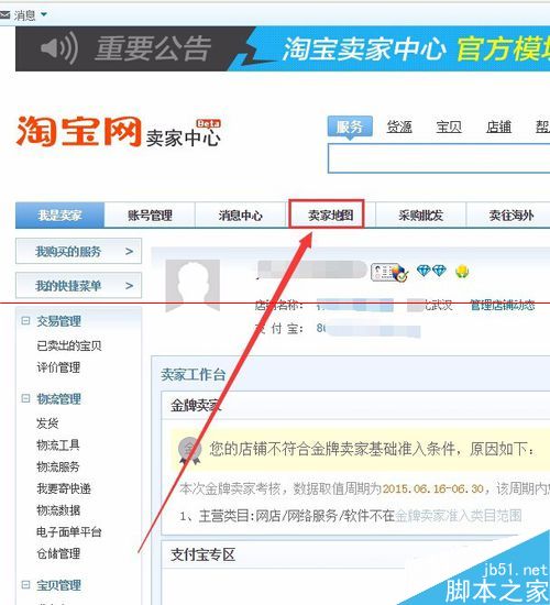 3、登錄上自己的淘寶賬號之后,我們點擊導航欄里的“賣家地圖” 如圖