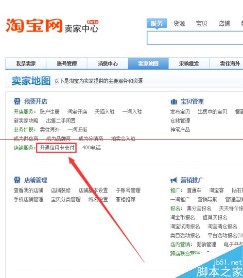 4、打開賣家地圖之后,我們點擊店鋪服務那里的“開通信用卡支付” 如圖
