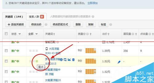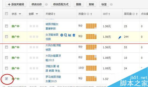 3、在推廣單元中,點(diǎn)擊關(guān)鍵詞推廣選項(xiàng),在關(guān)鍵詞列表中找到我們所要操作的關(guān)鍵詞,點(diǎn)擊勾選