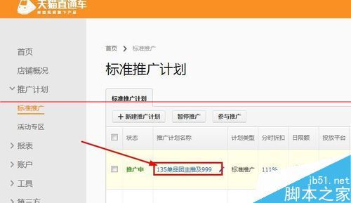 2、在左側(cè)的導(dǎo)航欄中點(diǎn)擊推廣計(jì)劃,在彈出的下拉框中點(diǎn)擊標(biāo)準(zhǔn)推廣,然后在標(biāo)準(zhǔn)推廣中找到你要操作的推廣計(jì)劃點(diǎn)擊打開