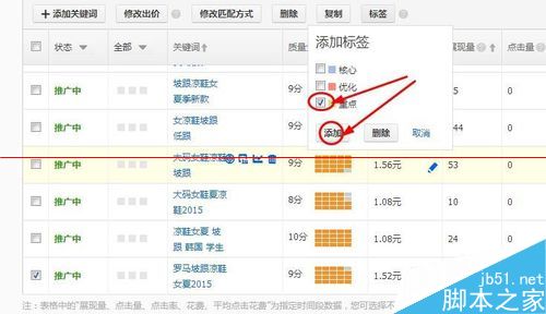 4、接下來點(diǎn)擊頂部導(dǎo)航欄中的標(biāo)簽?zāi)K,會(huì)彈出一個(gè)添加標(biāo)簽的下拉框。在下拉框中我們可以選擇核心、優(yōu)化、重點(diǎn),根據(jù)我們的需求進(jìn)行設(shè)置,勾選好以后點(diǎn)擊添加