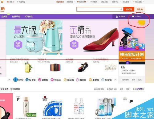 2、試用過后,在天貓登陸,并點開“我的淘寶”,找到“免費試用”。如果找不到“免費試用”,可以到百度里面搜素“淘寶試用”。