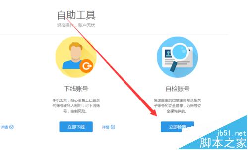 4、之后,用戶【自助工具】選項中點擊【自檢賬號】下面的【立即檢測】按鈕選項。進入到下一步驟。