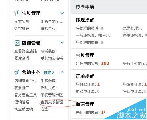 2、賣家中心左側功能欄里面的營銷中心下拉菜單會員關系管理。