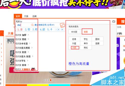 1、在淘寶搜索框內,輸入自己銷售的產品,如上裝女,這是搜索框馬上有相關提示,這些詞語都是熱搜詞語,其中橙色的搜索率最高簡稱熱詞,我們以主要挑選熱詞為主!這些詞語為買家長期搜索的詞語,系統自己保存的,非淘寶官方編寫,所以我們賣家放心使用!