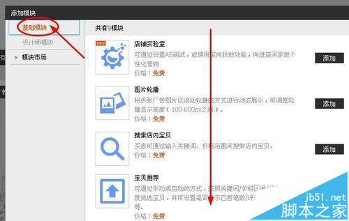 3、進(jìn)入后有三種選擇。第一個(gè),基礎(chǔ)模塊。意思是系統(tǒng)自帶的模塊,包括輪播、自定義內(nèi)容區(qū)、寶貝推薦等等常用模塊,都在這里。選擇好自己需要的模塊,點(diǎn),添加。