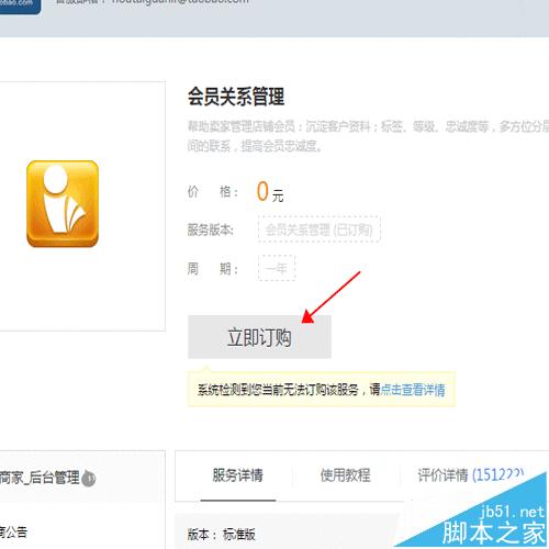 4、找到【會員關系管理】后,點擊它,接著點擊【立即訂購】。這個軟件是淘寶官方的,是唯一免費的打折軟件,其他打折軟件都是要錢的。(這里顯示我無法訂購該服務是因為我已經訂購過了,不能再訂購了)