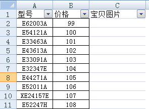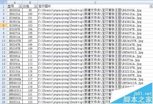 5、打開運(yùn)營給的活動價格表,將其改成如下圖的格式,在C2單元格輸入公式【="寶貝主圖文件夾路徑" & A2 & ".jpg"】(比如:="C:/Users/yuyaoyong/Desktop/新建文件夾/寶貝首張主圖/" & A2 & ".jpg"),然后將下面的單元格全部填充,結(jié)果如下圖