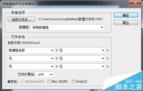 8、菜單欄中打開:文件>導(dǎo)出>數(shù)據(jù)組作為文件。按下圖方法將每個型號的PSD導(dǎo)出到指定文件夾中。中間可能會出現(xiàn)一些不能導(dǎo)出的文件,可能是價格表中的型號的寫的不整確,也可能是圖片不存在等,不管他們,記下不能導(dǎo)出型號,直接確定確定……