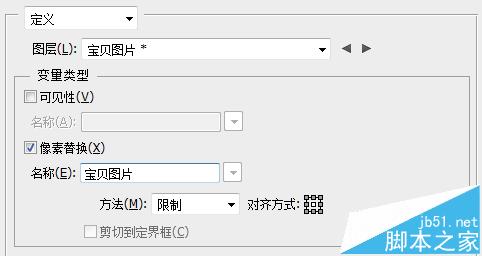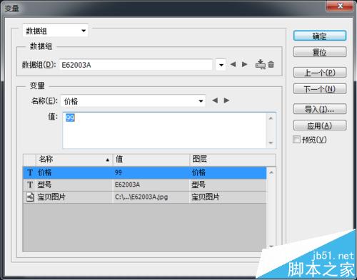 4、在這個模板中,菜單欄中打開:圖像>變量>定義,分別將三個圖層按下圖參數(shù)來定義好。
