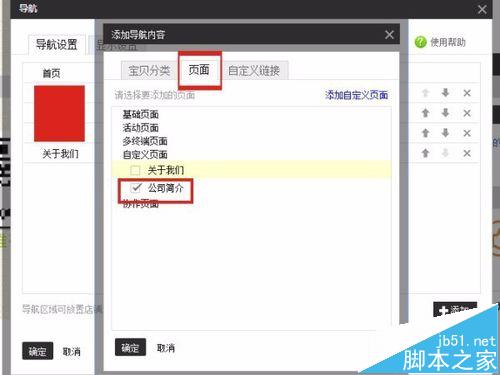 9、出現“添加導航內容”中選擇“頁面”,在勾選剛才設置“公司簡介”,按確定,如圖所示。然后發現“公司簡介”出現在首頁下面,再按確定