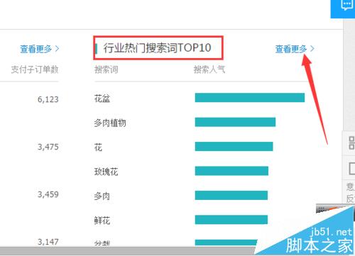 3、這個時候滑動鼠標,流量我們店鋪的主要核心數據,然后 在下方找到行業熱門搜索詞TOP10,點擊更多的話就是整個排行榜了。