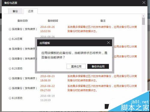 4、需要進行”還原“時,則點擊選擇你要還原的頁面,再點擊應用備份,有“直接應用”和“備份并應用”,假如你裝修好的頁面還被備份則選擇“備份并應用”比較好,假如備份好了,就直接選擇“直接應用”就OK。