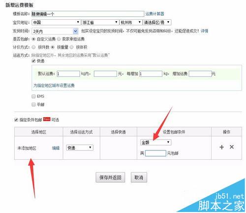 6、最下面有個指定條件包郵,就比如說滿百包郵等等 填寫好后 一定要記住要保存并返回