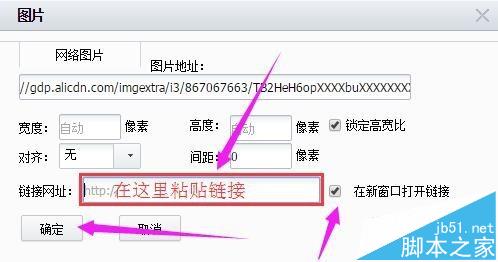 7、然后,我們回到剛才第4步的圖片設置框。在“鏈接網址”的框內粘貼剛才復制的收藏店鋪的鏈接。然后,再在“在新窗口打開鏈接”這里打上勾,這里打上勾,是當買家點擊店招時,網頁能跳轉到收藏店鋪的操作頁面。最后,點“確定”。
