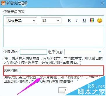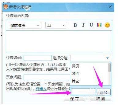 5、設(shè)置好分組后,然后,在“買(mǎi)家問(wèn)題” 這里輸入文字,是買(mǎi)家的問(wèn)題,比如,當(dāng)買(mǎi)家問(wèn):什么快遞?系統(tǒng)就會(huì)自動(dòng)的將這條短語(yǔ)發(fā)送給買(mǎi)家。