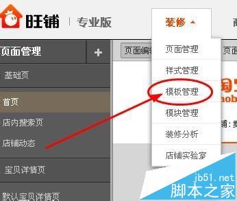 2、鼠標(biāo)移動(dòng)到“裝修”上面,在下拉菜單中,選擇,模板管理。