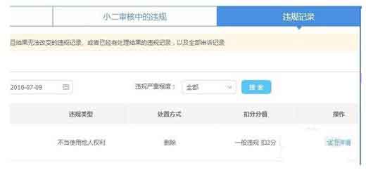 這幅圖是違規記錄頁面,列舉了違規對象(那個商品出了問題,有違規商品的ID),違規類型,處置方式,扣分分值和詳細。你可以查下是那個商品出了問題,點詳細,看具體的處罰原因和違規事件,處理方法。而且一般都會有小二的提醒,告訴你哪里需要改進和避免再次出這個問題。