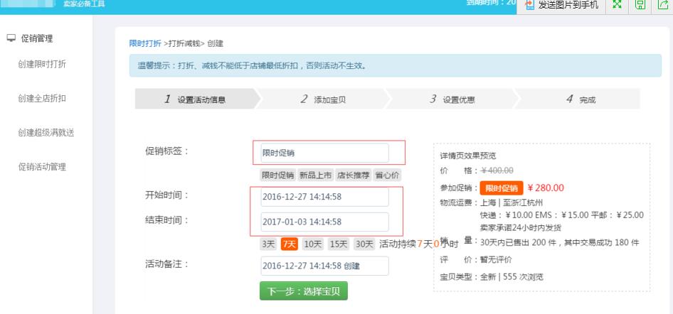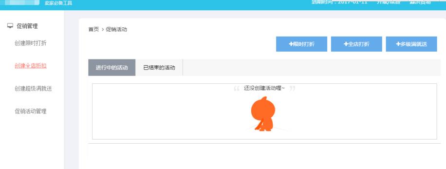 6、創(chuàng)建一個打折活動,這里可以對自己的寶貝打折促銷的標語和時間進行設置